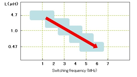 如果提高DC-DC轉換器電路的開關頻率,功率電感所需的L值就會下降,可以使整個DC-DC轉換器電路實現(xiàn)小型化。